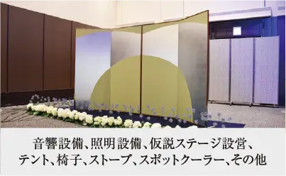 会場周辺の誘導サインや受付区分の看板も承ります。設備用のスタンド類のレンタルも行っております。ステージ幕(横断幕)や懸垂幕、会場入口に設置する門標(大門)の制作もお任せください。